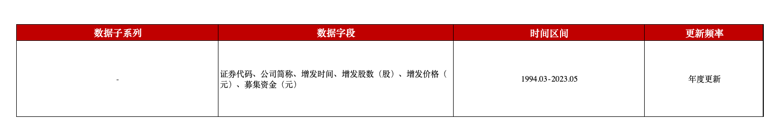 本平台推出A股上市公司增发信息数据,包含证券代码、公司简称、增发时间、增发股数、增发价格、募集资金等字段。