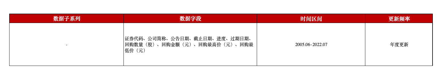 本平台推出A股上市公司股票回购数据,包含证券代码、公司简称、公告日期、截止日期、进度、回购数量、回购金额等字段。