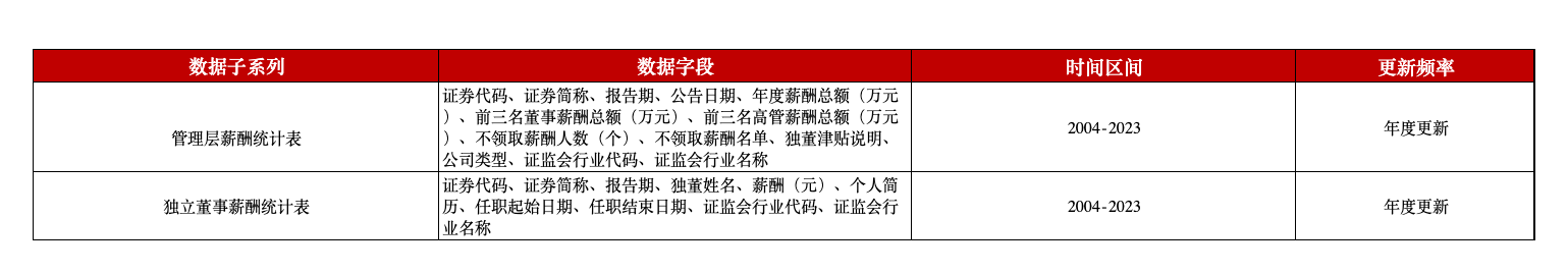 本平台推出A股上市公司高管薪酬数据,包含了管理层薪酬统计表、独立董事薪酬统计表2张表格。