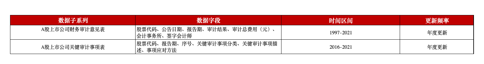 本平台推出A股上市公司财务报告审计意见数据,包含财务审计意见表和关键审计事项表,涵盖了股票代码、公告日期、报告期、审计结果、审计总费用、会计事务所、签字会计师、关键审计事项分类、关键审计事项描述、事项应对方法等字段。