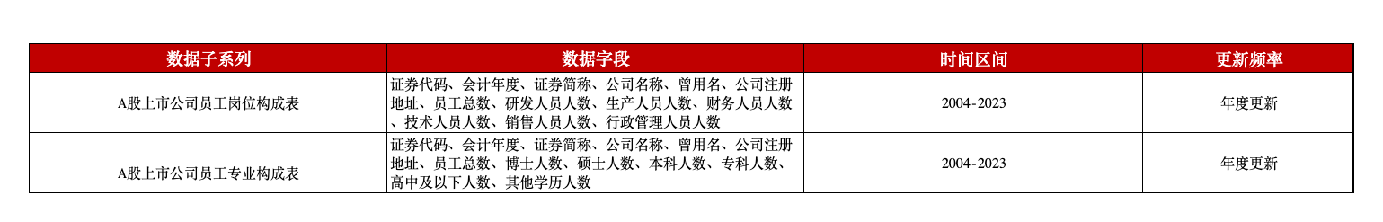 本平台推出A股上市公司员工构成数据,包含了A股上市公司2004至今的员工专业及岗位构成的相关信息。
