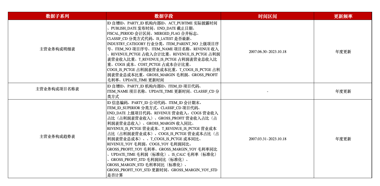 主营业务构成明细表:描述上市公司定期公告中披露的主营业务明细信息,与公告披露保持一致:1、公司在公告中每次披露的构成内容均会采集;2、主营业务构成有三种分类方式:分行业、分产品、分地区;3、采集公告起始报告期为2007半年度报告;4、单位:人民币元。