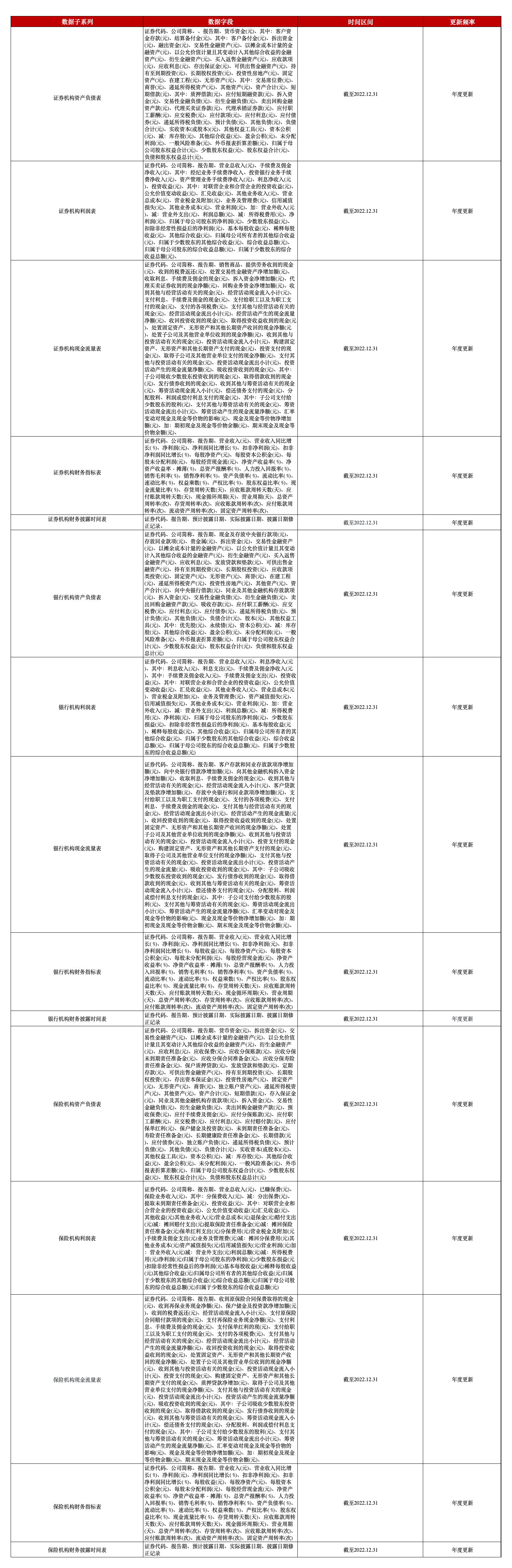 为助力相关研究,本平台推出A股上市金融机构财务报表数据,覆盖年报、季报、半年报,包含了上市金融机构资产负债表、上市公司金融机构表、上市金融机构现金流量表、上市金融机构财务指标表、上市金融机构财报披露时间表等5张表。