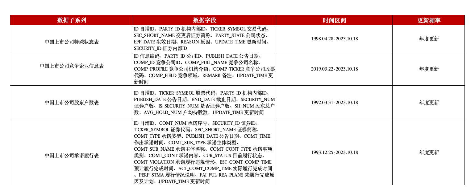 中国上市公司基本信息数据是本平台与通联数据合作的数据库,包含4张表格,分别是:
