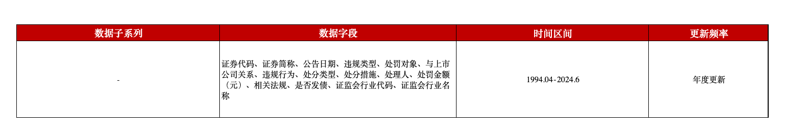 本平台推出A股上市公司违规处罚数据,包含了证券代码、公告日期、违规类型、处罚对象、与上市公司关系、违规行为、处理人、处罚金额等字段。