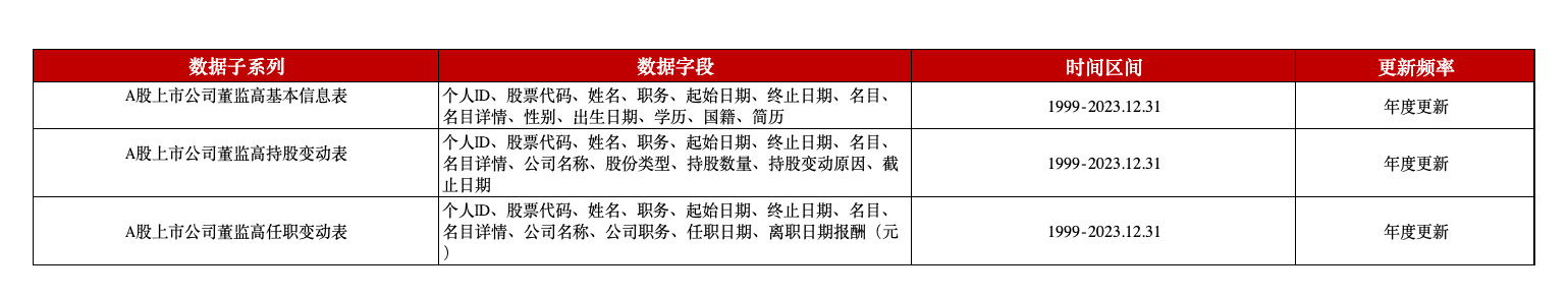 本平台推出A股上市公司董监高信息数据,包含了上市公司历届高管、董事会和监事会人员数据,分为上市公司董监高基本信息表、上市公司董监高持股变动表、上市公司董监高任职变动表。
