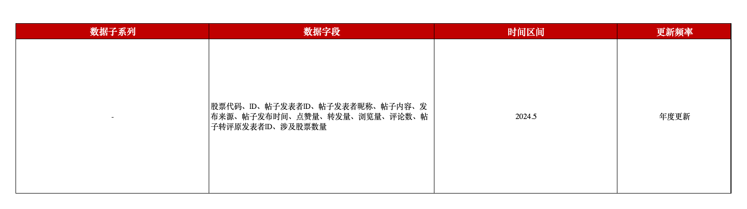本平台推出的A股上市公司雪球投资者发帖评论数据以文本信息内容为主,直观展现各贴内容情况,包含股票代码、帖子发表者id/昵称、发布来源及时间、点赞量、转发量,评论数等多个字段。