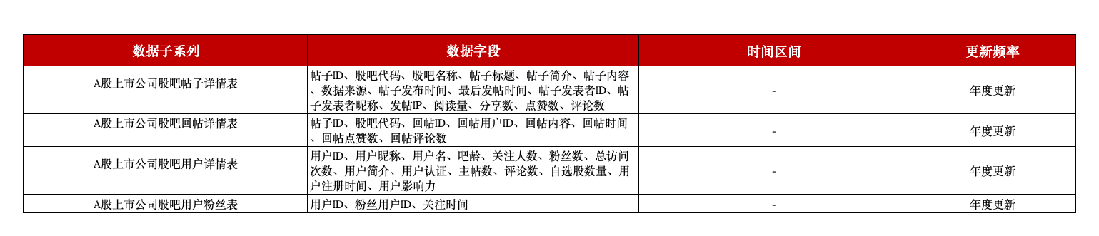 本平台发布的A股上市公司股吧文本数据以文本信息内容为主,充分展现投资情绪,同时也直观展现各帖内容情况、发帖人账号注册省市、关注与被关注等多方面内容,尤其各表之间以帖子ID和用户ID为主体字段,增强了表格之间的关联度,提升使用感。