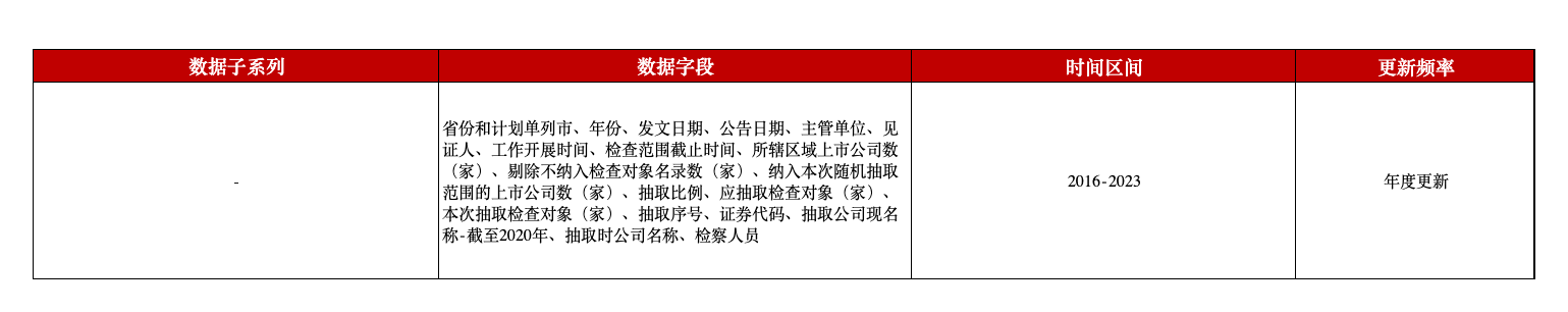 本平台推出了A股上市公司现场检查随机抽查数据,包括省份和计划单列市、发文日期、工作开展时间、检查范围截止时间、所辖区域上市公司数、抽取时公司名称等字段。