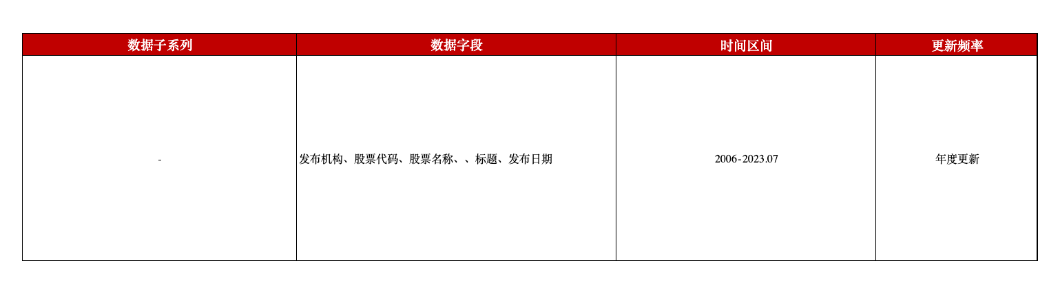 本平台推出的A股上市公司分析师研报文本数据,数据时间长达17年之久,数据展现形式为结构化表格以及PDF原文,涵盖报告标题、发布机构、发布时间等多个字段。