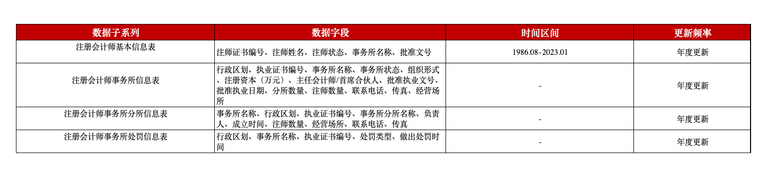 本平台整理注册会计师及事务所信息,覆盖注册会计师、事务所分所、事务所处罚等多个信息,囊括:事务所名称、批准执业文号、执业证书编号、行政区划、成立时间、处罚类型、注师数量等字段内容,为相关研究提供数据助力。