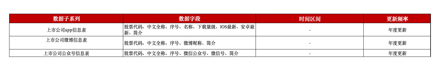本平台推出A股上市公司社交媒体账号数据,区分为:上市公司app信息表、上市公司微博信息表、上市公司公众号信息表三张表格。其中,上市公司母公司app信息表更是包含截至2023年5月数据整理时的下载量级,为上市公司相关研究提供数据资源。