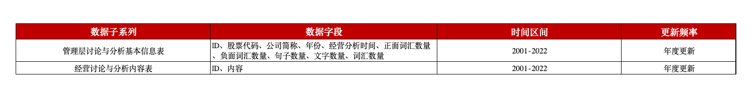 本平台推出A股上市公司管理层讨论与分析数据,包含了管理层讨论与分析基本信息表、经营讨论与分析内容表2张表,涵盖股票代码、年份、经营分析时间、正/负面词汇数量、句子数量、分析内容等。