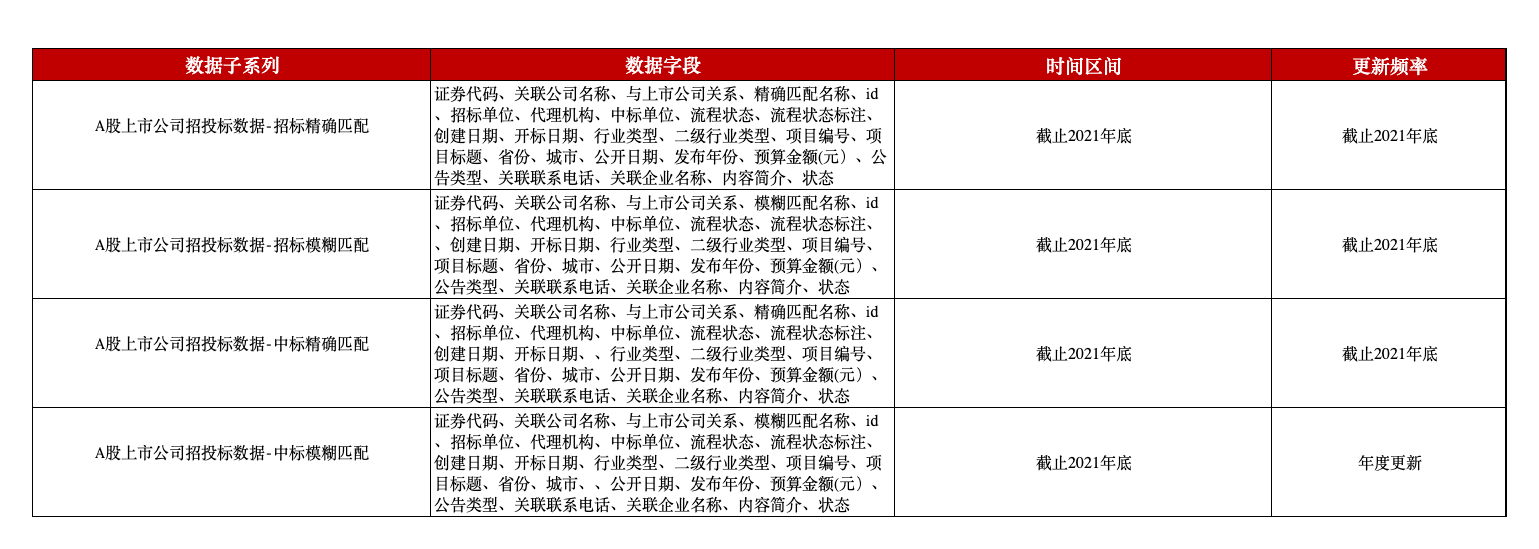 本平台通过识别上市公司及其子公司是否为招标单位或中标单位,并根据上市公司名称进行精确匹配与模糊匹配两种处理方式,推出A股上市公司招投标数据,涵盖证券代码、关联公司名称、与上市公司关系、招标单位、中标单位、流程状态、行业类型、项目编号、项目标题、发布年份、预算金额(元)等字段,为相关研究助力!