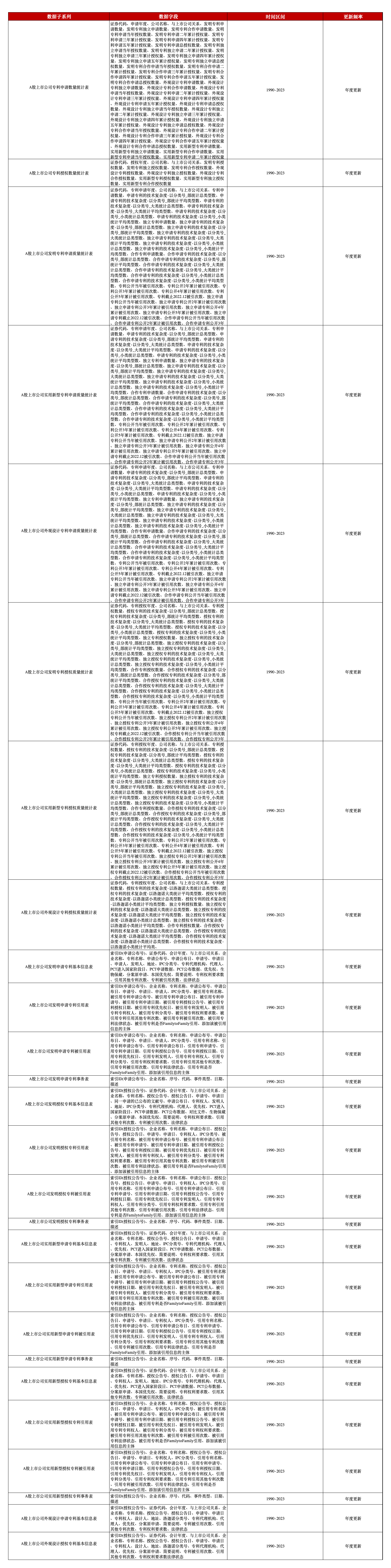 作为本平台专利系列数据之一,A股上市公司专利及引用被引用数据提供了中国A股上市公司的专利数量统计表、专利质量统计表、专利详情表三个子表,不仅从数量和质量两个方面对中国A股上市公司的专利表现进行评价,更囊括上市公司的详细专利信息,完整包含了上市公司及其子公司、联营公司、合营公司的所有专利信息,是对本平台专利系列数据库的有力补充 。