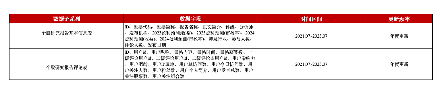 本平台推出的A股上市公司分析师研报及评论数据,包含个股研究报告基本信息表和个股研究报告评论表两个部分,数据展现形式为结构化表格以及PDF原文,涵盖报告标题、分析师、发布机构、回帖内容、用户信息等多个字段,不仅可以提供研报基本信息情况,也提供了股市关注者的评论内容。
