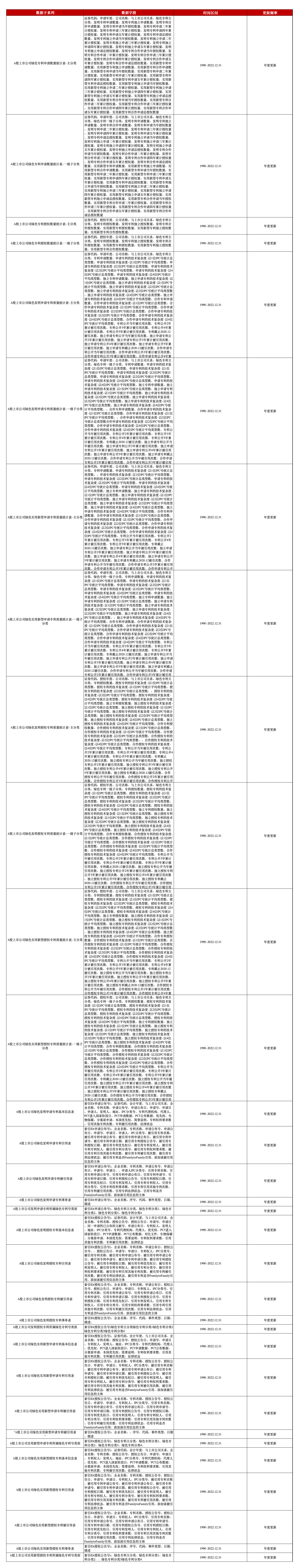在数据结构上,本数据的专利数量统计表和质量统计表分别以专利申请和专利授权为依据再进行划分,专利质量统计表还按专利类型细分为专利申请、专利授权两个模块,每模块按专利类型区分为绿色发明专利表、绿色实用新型专利表,同时进行了绿色专利的主分类、一级子分类统计。在详情表中,该数据库中的每张表均包含设置相同的四个模块:发明公布、发明授权、实用新型申请、实用新型授权,各模块分别展示了不同类型专利的基础信息、引用信息、被引信息、事务信息,且均有所属的绿色专利号以区分不同绿色专利的类别。需要注意的是,外观设计没有绿色专利。