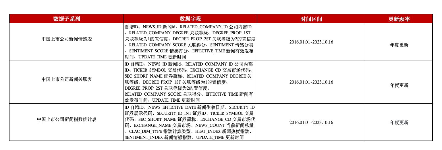 中国上市公司新闻舆情数据是本平台与通联数据合作的数据库,包含3张表格,分别是: