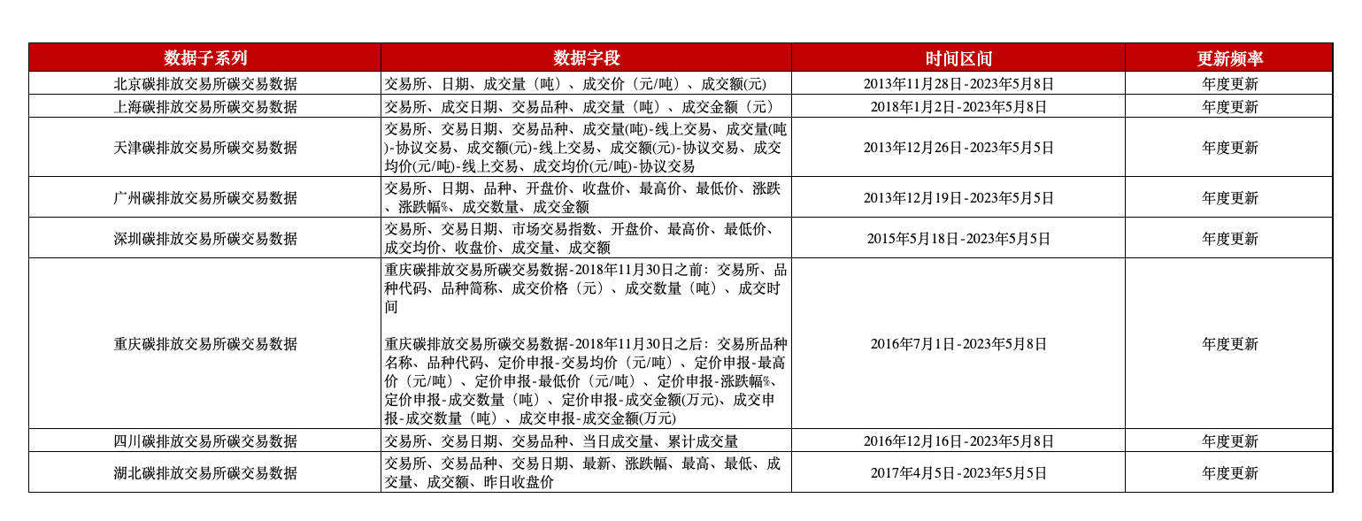 在2011年10月以来,中国陆续建设了7家主要的碳排放交易所:广州碳排放权交易所、深圳排放权交易所、北京环境交易所、上海环境能源交易所、湖北碳排放权交易所、天津排放权交易所和重庆碳排放权交易所,本数据除囊括以上地区交易所的数据以外,还另外收录了四川联合环境交易所碳交易平台的数据。