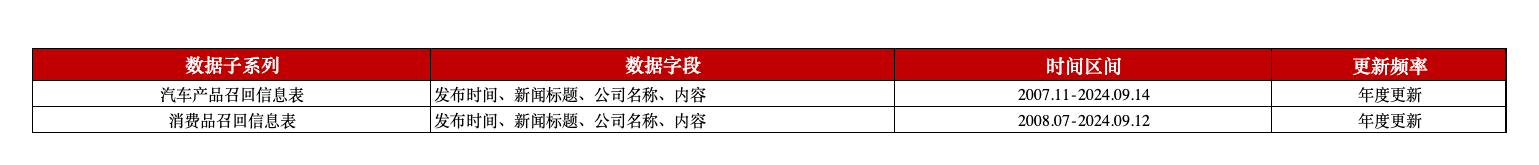 本平台对缺陷产品召回数据进行整理,分为汽车产品召回信息表和消费品召回信息表,包含发布时间、新闻标题、公司名称、内容字段,为相关研究提供优质的数据资源。