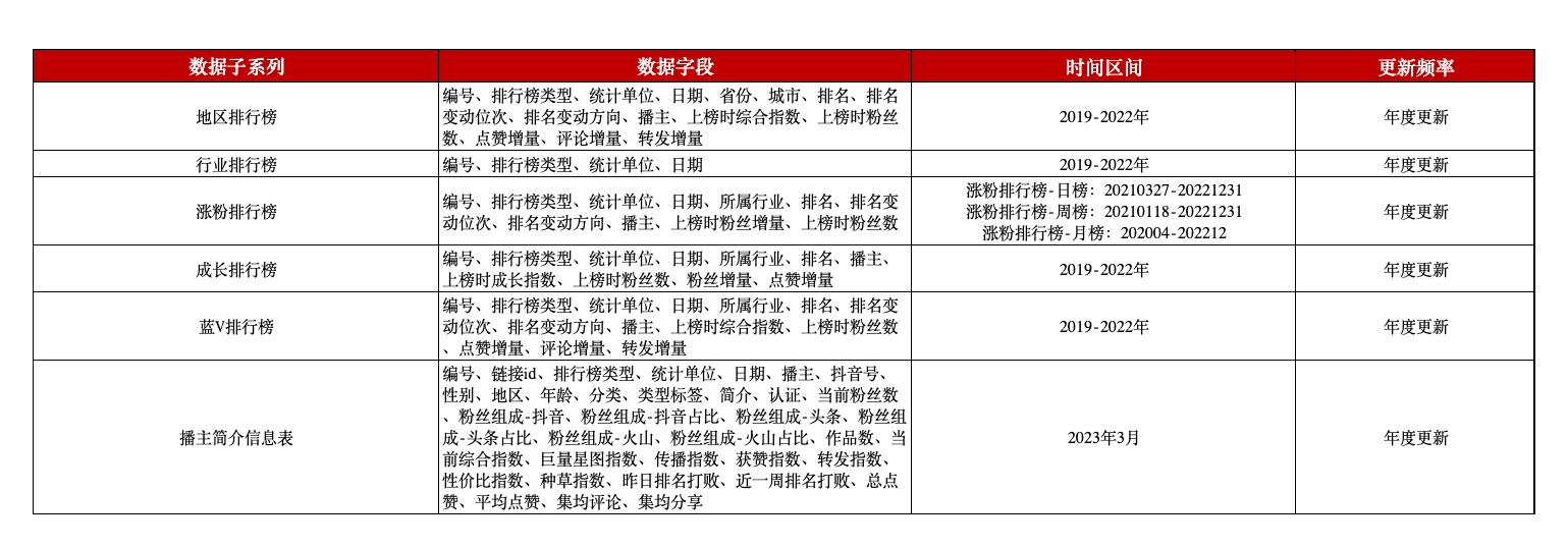 抖音作为一款国民级短视频App,汇集了大量的短视频播主进行内容创作。本平台整理了抖音短视频播主的关注、点赞、评论、分享等影响力情况,以日榜、周榜、月榜为统计频率,提供了地区、行业、张粉、成长、蓝V五个排行榜单,汇总出不同榜单排名前20的播主排名情况和个人信息简介,为研究媒体相关的研究提供了微观数据支持。