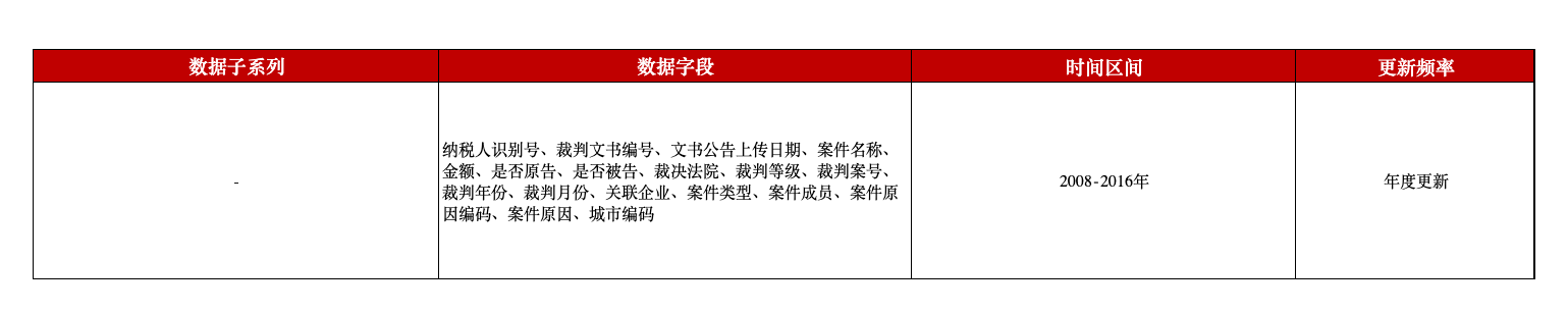 本平台对参与全国税收调查的企业名单进行汇总整理,推出税收调查企业裁判文书数据,包含裁判文书编号、案件名称、裁判法院、案件类型等等,为相关研究助力。