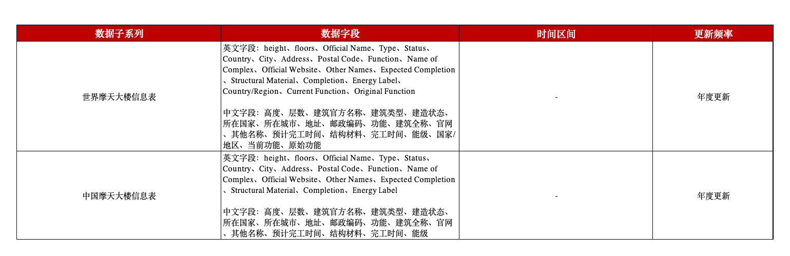 本平台数据库搜集整理了全球摩天大楼的详细数据,涵盖高度、层数、建筑官方名称、建筑类型、建造状态、所在国家、所在城市、地址、邮政编码、功能、建筑全称、官网、其他名称、预计完工时间、结构材料、完工时间、能级、当前功能、原始功能等全方位信息,为研究建筑科技、城市发展、人口聚集等问题提供数据支撑。