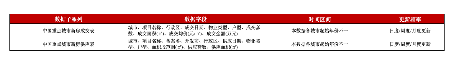 为助力相关研究,本平台推出中国重点城市新房供应与成交详细数据,覆盖全国多个重点城市的房屋交易相关信息,并分为新房成交表、新房供应表两表,指标丰富,信息全面。