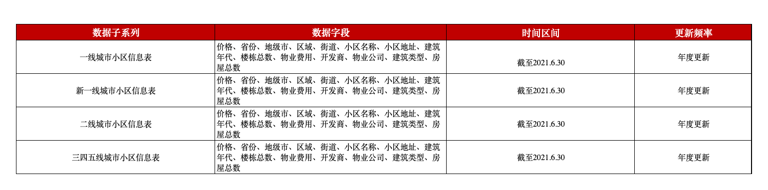 本平台中国小区信息数据全面覆盖全国28个省级行政区、直辖市与对应92个重点城市的住房小区分布信息;更进一步地,本数据按城市类型划分为四张表格,针对性强,层次鲜明,具有极强的研究代表性。本数据为研究我国房屋空置率、房地产调控政策效果和未来房价趋势提供优质的大数据样本,还可以使我们从住房视角窥探城市发展状况、我国的城镇化进程乃至宏观经济增长。