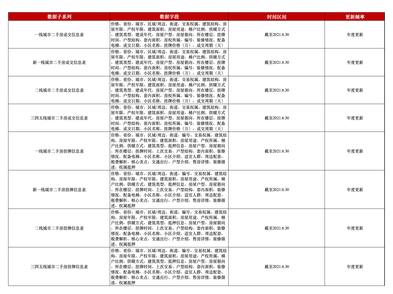 本平台推出全国二手房数据,该数据全面覆盖全国28个省级行政区、直辖市与对应九十多个重点城市的二手房分布信息,并按照房屋交易情况划分为二手房成交信息数据和二手房挂牌信息数据;更进一步地,成交数据和挂牌数据按城市类型划分别分为四张表格,针对性强,层次鲜明,具有极强的研究代表性。本数据为研究我国房屋空置率、房地产调控政策效果和未来房价趋势提供优质的大数据样本,还可以使我们从住房视角窥探城市发展状况、我国的城镇化进程乃至宏观经济增长。