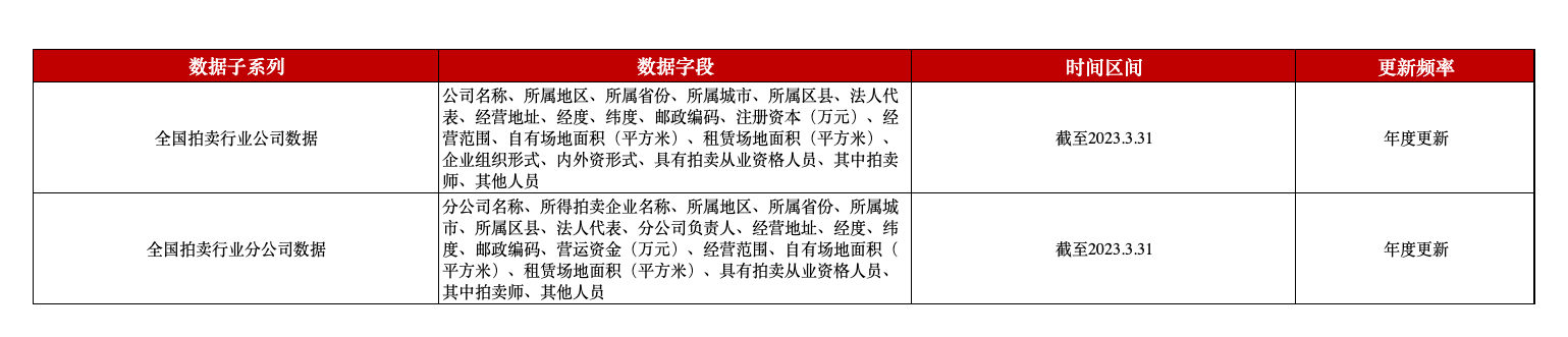 本平台推出全国拍卖行业企业数据,包含全国范围内的拍卖行业公司名称及分公司名称、所在地、经营范围、注册资本、场地面积、人员数量等信息,并额外提供了所在地的经纬度,以更好地支撑相关学术研究。