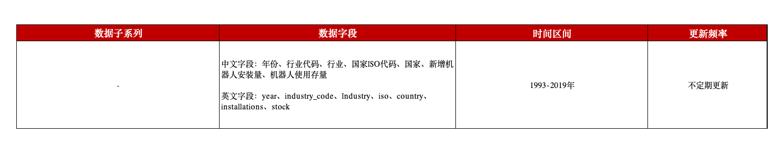 根据ISO-8373-2012的定义,工业机器人是指能够自动控制、可重复编程,可以在三个或更多轴上进行编程,并能够在固定或移动平台上实现人类要求的工艺步骤,包括但不限于制造、检验、包装和装配等。国际机器人联合会(IFR)公布的全球工业机器人数据库,该数据库提供了全球100多个国家或地区符合ISO标准的工业机器人的总体数量,是目前研究机器人应用最权威的数据库,已被广泛应用于相关研究。IFR工业机器人数据主要采用的国际标准行业分类(ISIC),一些涉及少量机器人应用的行业被汇总,一些主要消费行业(特别是汽车行业)则被进一步的细分。