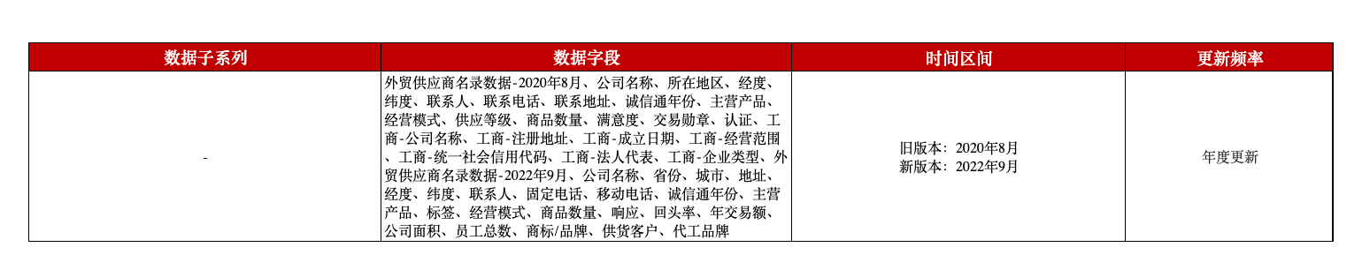 本平台根据国内的B2B平台推出外贸供应商名录数据,涵盖企业名称、地址、主营产品、标签、经营模式、商品数量、年交易额等基本信息,为国内外贸易的相关研究提供数据支持。