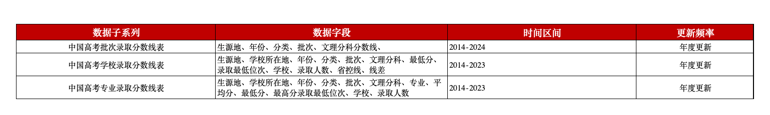 本平台推出中国高考录取分数线数据,从批次、学校、专业等三方面汇总高考录取情况,涵盖生源地、学校所在地、年份、分类、批次、分科、分数线、学校、专业、录取人数、最高/低分等字段,为相关研究提供优质的数据资源。