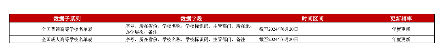 本平台中国高等学校名单数据库整理了教育部公布的我国高等学校名单,并分为普通高等学校名单和成人高等学校名单2张子表,包含学校名称、学校标识码、主管部门、所在地、办学层次、备注(是否民办)等字段,本名单未包含中国台湾省、中国香港特别行政区和中国澳门特别行政区的高等学校。