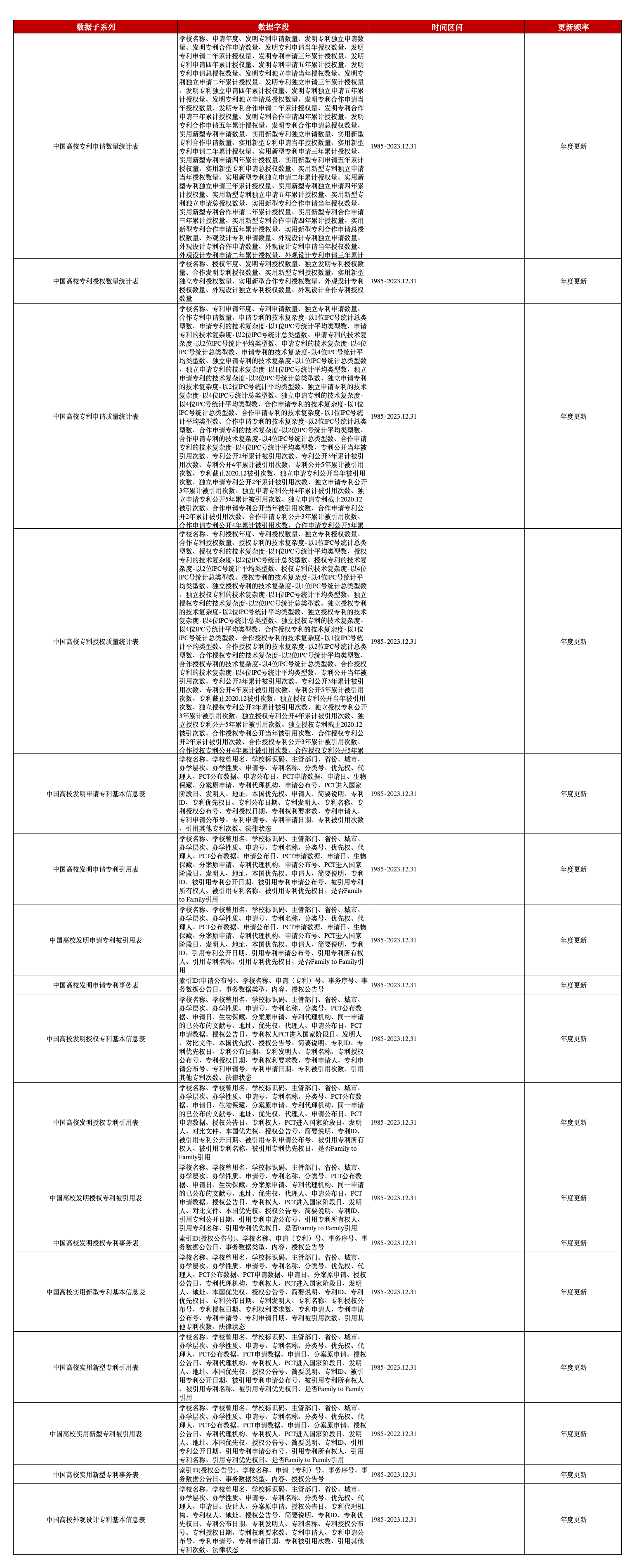 作为衡量高校科技创新成效的重要指标,专利统计数据和专利引用数据分别在数量和质量双方面给予数据支持。本平台高校专利数据包含专利统计、专利引用被引用两个部分,其中,专利统计数据分为数量统计表和质量统计表,这两类表分别以专利申请和专利授权为依据再进行划分,更进一步地,专利质量统计表还按专利类型细分为发明、实用新型、外观设计三模块。专利引用及被引信息在此数据中体现于专利详情表部分,与上市公司、工业企业等专利引用被引用数据相同,分发明申请、发明授权、实用新型、外观设计四模块,各模块包含基础信息表、引用表、被引用表、事务表四张表格(外观设计无引用表、被引表、事务表)。