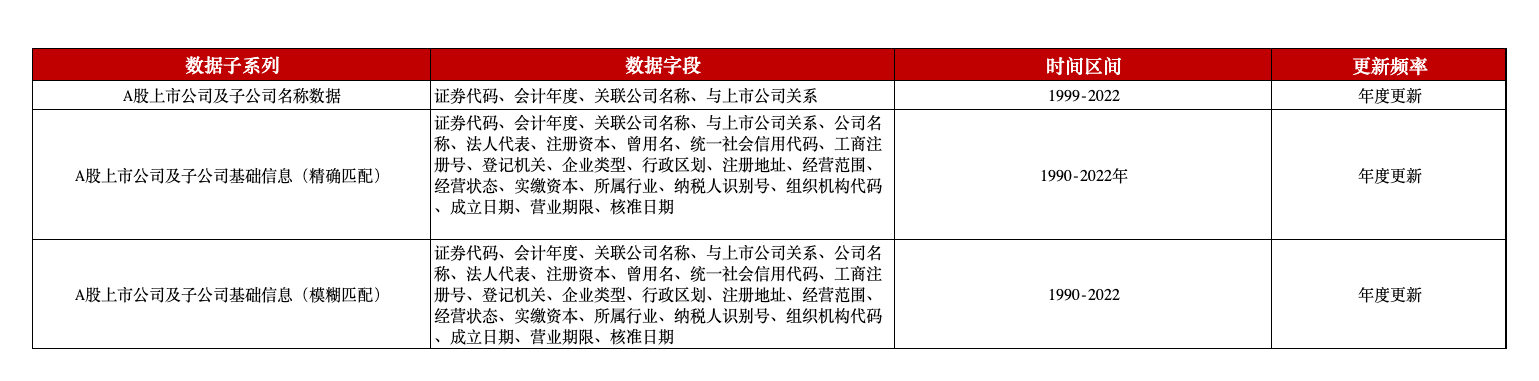 本数据补充了上市公司,特别是上市公司的下属关联公司在很多基础信息方面的缺失,如企业组织机构代码、纳税人识别号、经营范围、经营状态、经营期限及地址等,该数据的推出有助于学者与其他数据信息进行更进一步的深度匹配,增加学者数据使用的便利性。