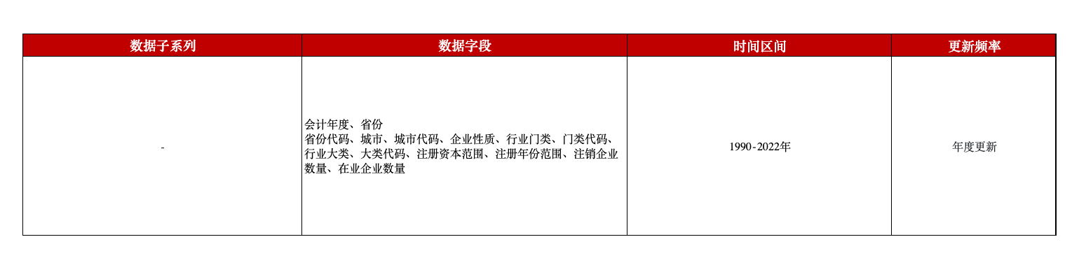 公开披露的中国工商注册企业基本信息为企业研究提供了数据支持。以往的工商注册企业进入退出相关的统计大多是基于某一给定的年度,统计该年度新进入、退出的企业数量,本数据则是基于某一给定的年度,统计进入市场一段时间内的企业的注销和在业情况,即能够直观展示注册1年内、1-3年内、3-5年内、5-10年内注册的某年某市的企业在当年的注销和在业情况,且做了企业性质、行业大类的统计区分,为研究中国企业生存状况、企业寿命等问题提供了极佳的数据支撑。