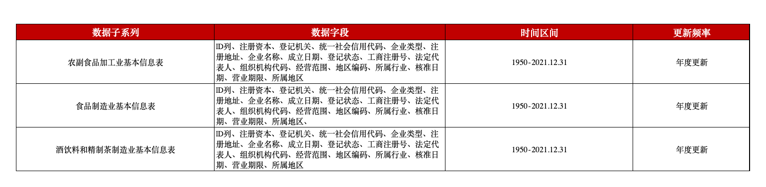 本平台依据国民经济行业分类,将食品行业分为3个部分:农副食品加工业、食品制造业、酒饮料和精制茶制造业等。同时,分类展示了相关企业的工商注册基本信息,重点字段包含有:注册资本、统一社会信用代码、工商注册号、法定代表人、所属区域等等。该数据库充分体现了自1950年起食品制造行业的企业增量情况与发展状态。