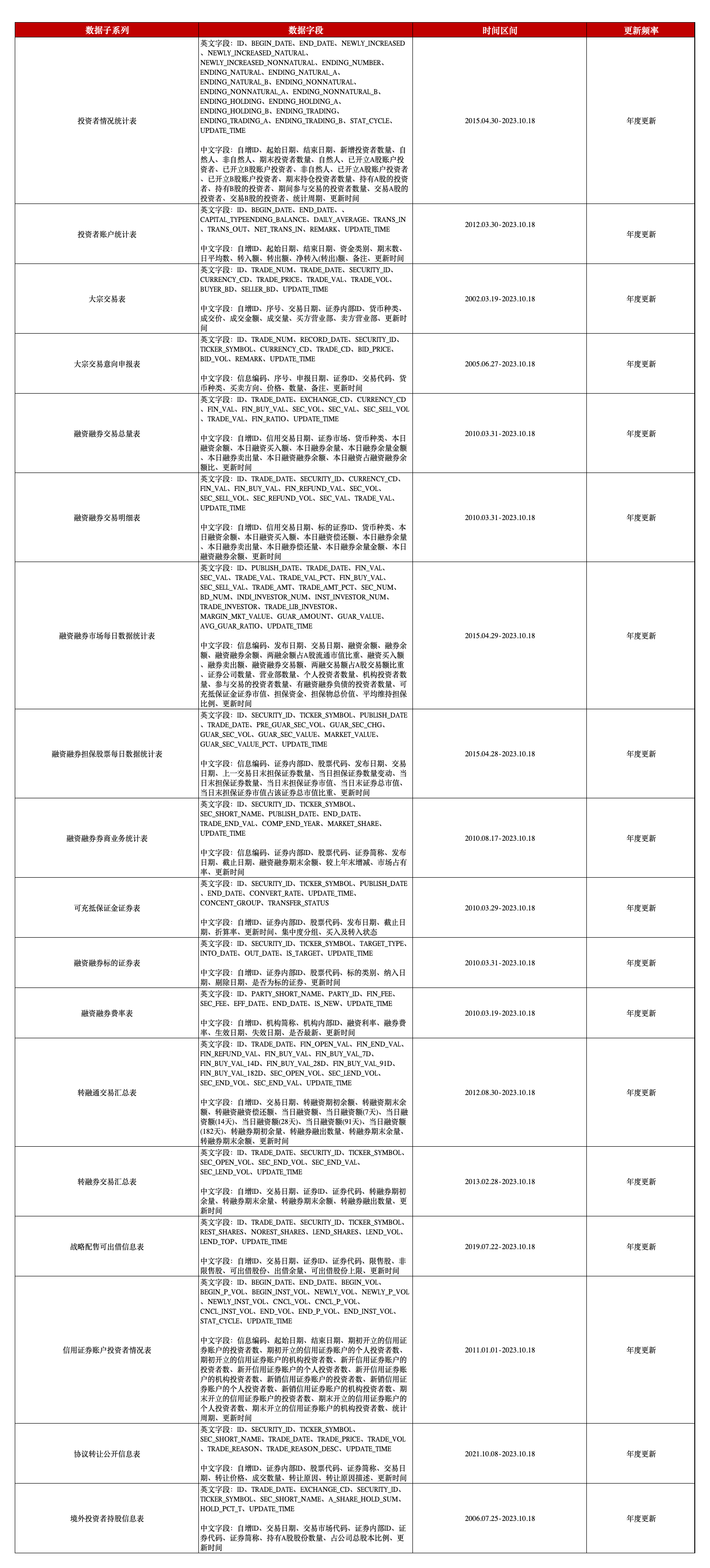 转融通交易汇总表:记录每个交易日的转融资、转融券交易汇总的信息,包括转融资期初余额、转融资期末余额、转融资融资偿还额、当日融资额、当日融资额(7天、14天、28天、91天、182天)、转融券期初余量、转融券融出数量、转融券期末余量、转融券期末余额,本交易日可获取前一交易日的数据。