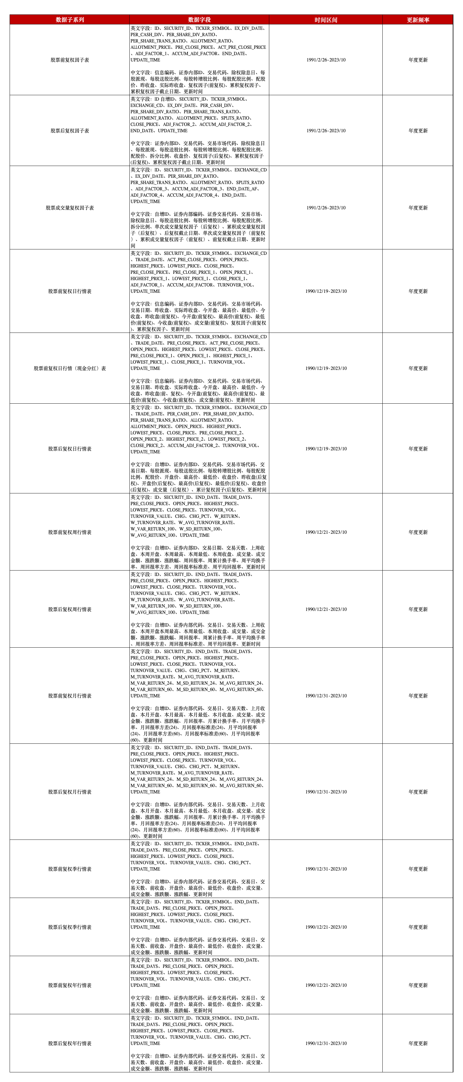 中国上市公司股票未复权行情数据中国上市公司股票未复权行情数据,包含6张表格,分别是: