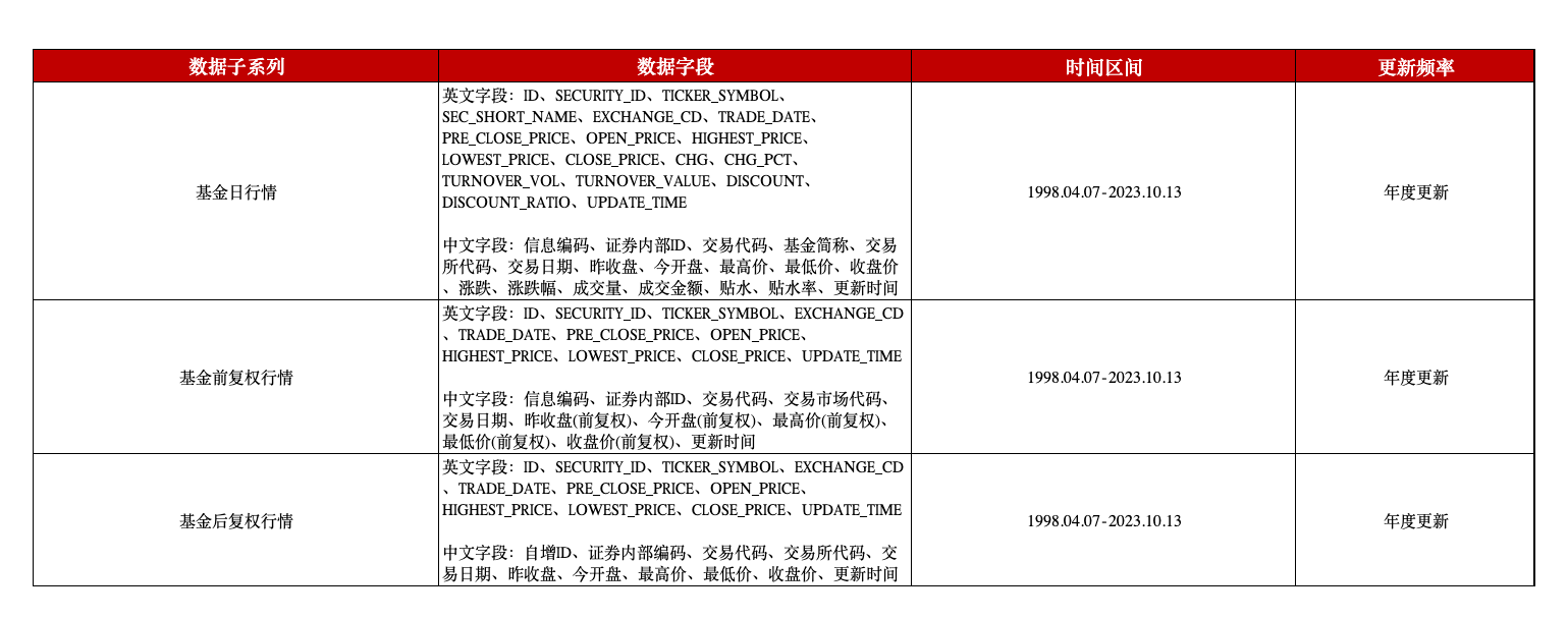 中国基金行情数据是本平台与通联数据合作的数据库,包含3张表格,分别是: