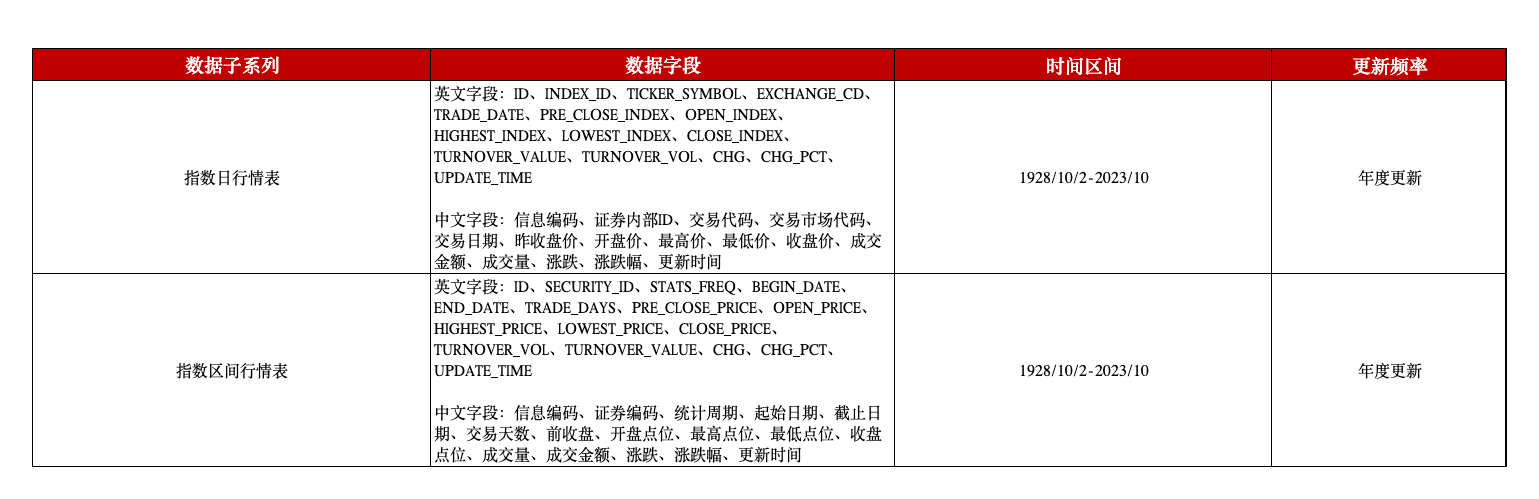 指数区间行情:指数区间行情信息,统计周期包括周、月、季、半年、年,字段包括昨收盘、开盘点位、最高点位、最低点位、收盘点位、成交量、成交金额、涨跌、涨跌幅等。