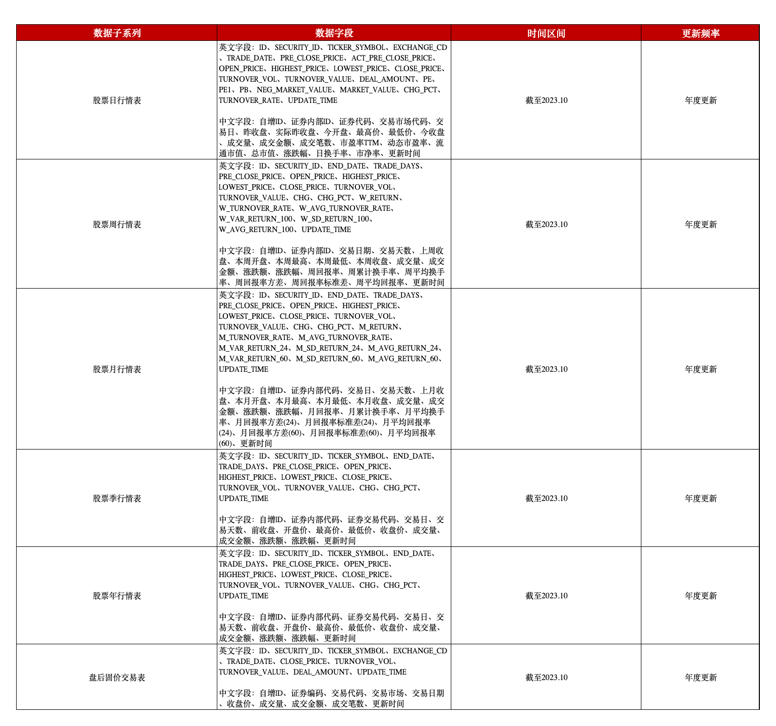股票年行情表:获取沪深京股票未复权年行情,在未复权日行情基础上计算,包含昨收价、开盘价、最高价、最低价、收盘价、成交量、成交金额等字段(含科创板)。
