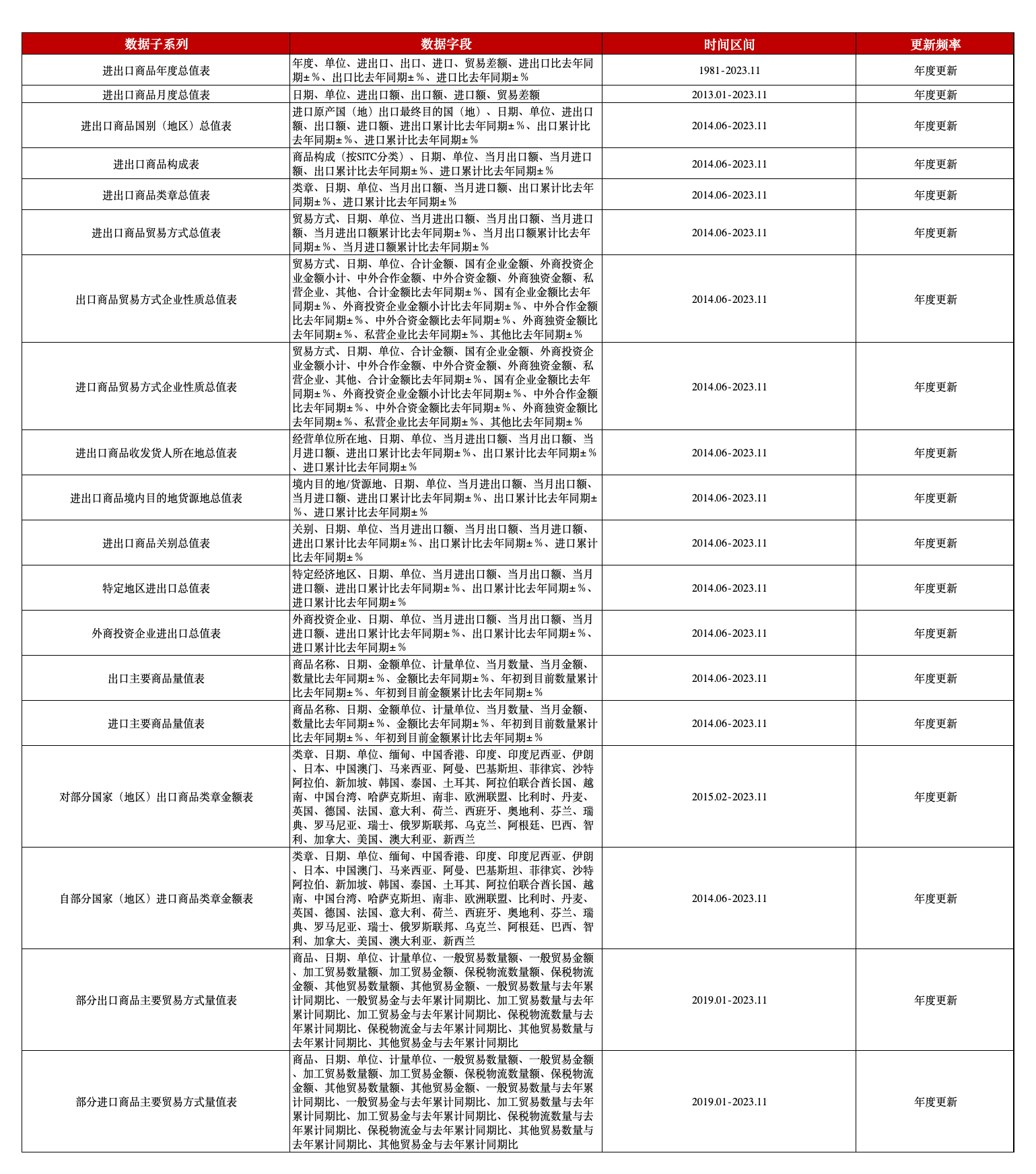 本平台中国海关统计数据库整理了来自中华人民共和国海关总署的进出口货物贸易统计数据,包括18个子表,涵盖进出口商品年度总值、月度总值、国别、商品构成、商品类章总值、贸易方式总值、企业性质总值表、收发货人所在地总值、目的地/货源地总值、商品关别总值、特定地区进出口总值、外商投资企业进出口总值、主要商品量值等信息,为研究中国进出口贸易相关问题提供权威、准确、全面、及时的数据支持。