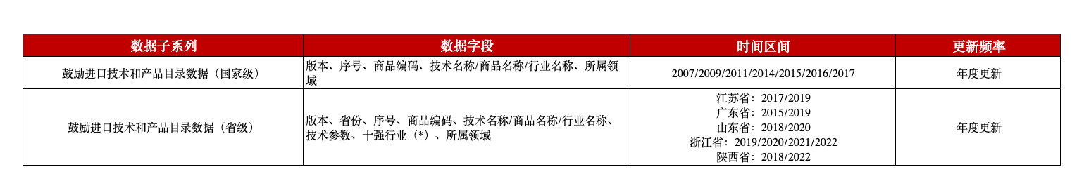 本平台整理了鼓励进口技术和产品目录数据,涵盖国家级和省级两个维度,包括版本、省份、序号、商品编码、技术名称/商品名称/行业名称、技术参数等字段。