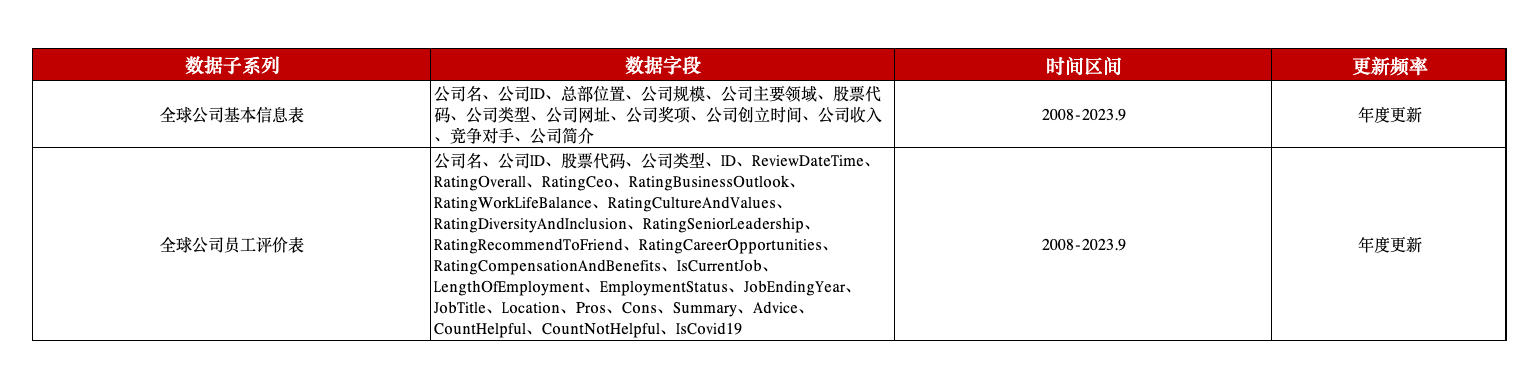 本平台推出的Glassdoor全球公司员工评价数据,分为基本信息表、员工评价表2张表,包含公司的基本情况及员工对雇主的评价(包括对工作、公司、环境的满意度),以及薪酬福利、文化价值观、企业展望、是否推荐等多方面指标。