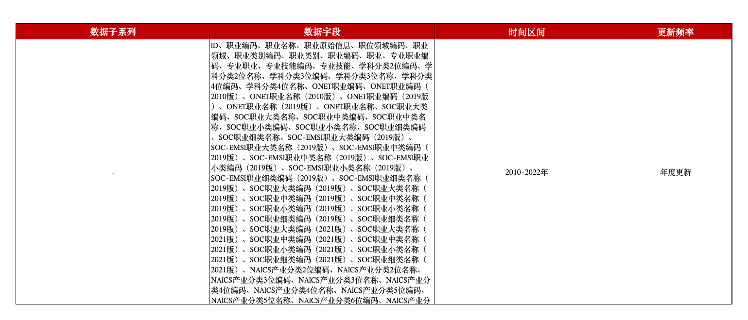 本平台数据团队推出美国公司招聘信息数据,涵盖互联网招聘平台、公司等数万个公开来源,本数据采用了自然语言处理的方式进行了职位、岗位职责、行业等内容的标准化处理,包含职位名称、专业技能、学科分类、产业分类、公司名称、地址、薪资、经验要求、学历要求、数据来源、发布日期等字段。