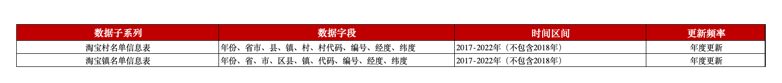 本平台梳理形成了“淘宝村”和“淘宝镇”名单数据,名单中相关信息依据《中华人民共和国乡村振兴促进法》和国家统计局《2021年统计用区划代码和城乡划分代码》中有关城乡划分标准,共有淘宝村和淘宝镇两个信息表,包含省、市、区县、村、经纬度等关键字段,可以为研究农村经济问题提供数据支持。