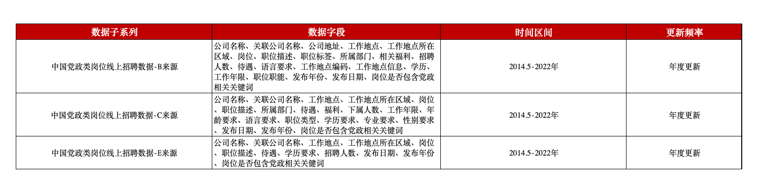 企业需要建设一支素质好、结构优、能力强的党政人才队伍。中国党政类岗位线上招聘数据在“岗位”和“职位描述”中检索党政相关关键词,包含三个招聘数据来源的党政岗位招聘信息,涵盖公司名称、工作地址、岗位、招聘人数、待遇、工作年限、学历、发布日期、岗位是否包含党政相关关键词等字段。